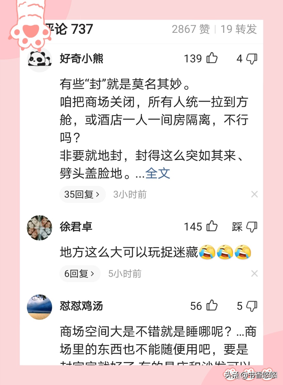 有网友对这样的封闭方法提出了质疑:有些封就是莫名其妙,咱把商场关闭,所有人统一拉到方舱或酒店,一人一间房隔离不行吗?非要就地封,封得这么突如,其来劈头盖脸的。这要是遇到个没厕所没水电的地方呢,封里面一个月坐牢啊!