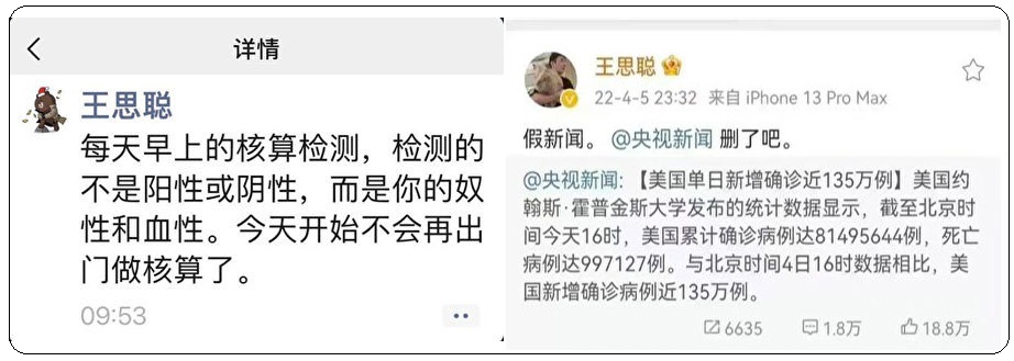 近日,上海饱受高压的防疫措施困扰,数以百万市民轮番接受核酸检测,严重影响生活。王思聪的微博账号也出现了新的金句:“每天早上的核算(酸)检测,检测的不是阳性或阴性,而是你的奴性和血性。今天开始不会再出门做核算(酸)了。”