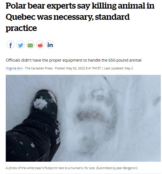 就在刚过去的周日(5月1号),加拿大警方开枪打死了一只徘徊在该物种正常领地以南数百公里的魁北克社区的北极熊,引起人们的关注。专家警告称由于全球变暖,海冰覆盖变得更加不可预测,这起事件可能会变得更加普遍。