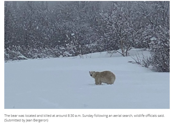 这只北极熊于周日上午被击毙,专家们也称它出现在不应该出现的地方,有可能造成危险,不得不射杀。