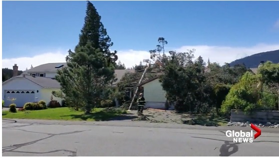 今天,Nanaimo 和 Ladysmith遭到壹場反季風暴的吹襲,很多地區出現停電,樹木倒塌。加拿大環境部發布了溫哥華島大部分地區、陽光海岸和南部海灣群島的強風警告。預報稱有每小時 70 公裡的強西南風,陣風為 90 公裡/小時,但預計下午之後會減弱。