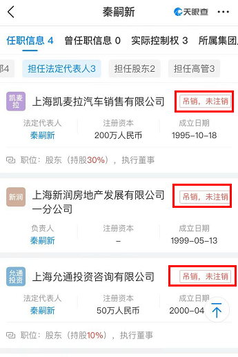 作為“金主”的秦嗣新,其職業也引發了諸多猜測。天眼查信息顯示,其曾經擔任叁家公司的法人,目前均處於“吊銷未注銷”狀態。