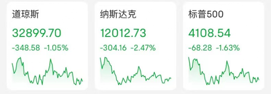 非农数据造成的忧虑迭加特斯拉的下跌拖累大盘,美三大股指盘前齐跌,开盘低开,最终全部收跌。截至收盘,道指跌348.58点,跌幅为1.05%,报32899.70点;纳指跌304.16点,跌幅为2.47%,报12012.73点;标普500指数跌68.28点,跌幅为1.63%,报4108.54点。三大指数本周跌幅均超过1%。