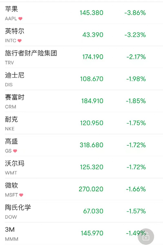 道指成分股方面,苹果跌3.86%,英特尔跌3.23%,纷纷领跌道指。