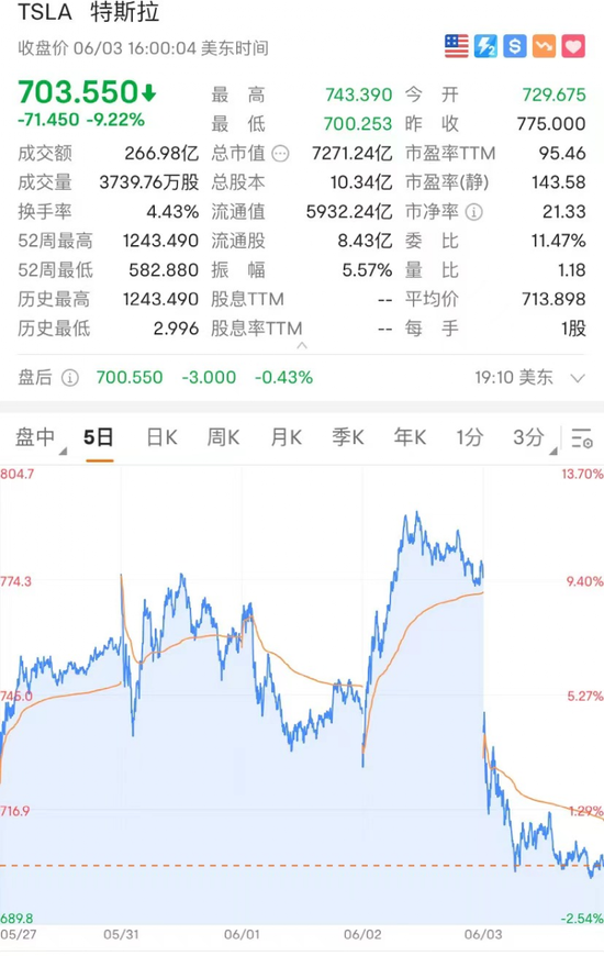 投资者担心马斯克会因为对推特的交易而卖出对特斯拉的部分持股。特斯拉盘中一度跌9.6%,截至收盘,收跌9.22%,报每股703.55美元,一夜市值蒸发约672亿美元(约4400亿人民币),最新总市值7271亿美元。