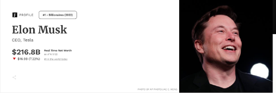 而这也直接影响到了身家以特斯拉股票为主的马斯克个人财富。根据福布斯全球的实时计算,马斯克身家一夜蒸发169亿美金(约1115亿人民币),目前至2168亿美元,仍为全球首富。