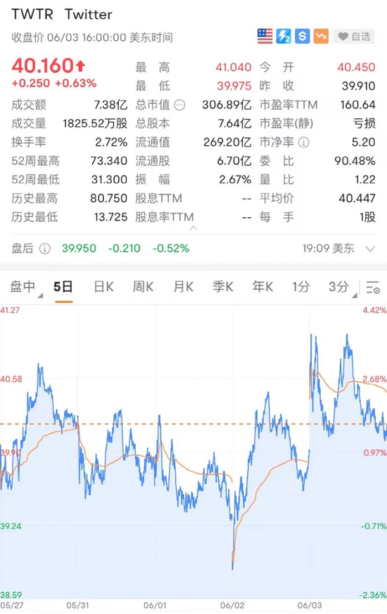 然而,马斯克对推特收购的障碍被扫清的消息使得推特股价上涨,一度涨超2%,收盘涨0.63%,报40.16美元/股,最新总市值306.89亿美元。