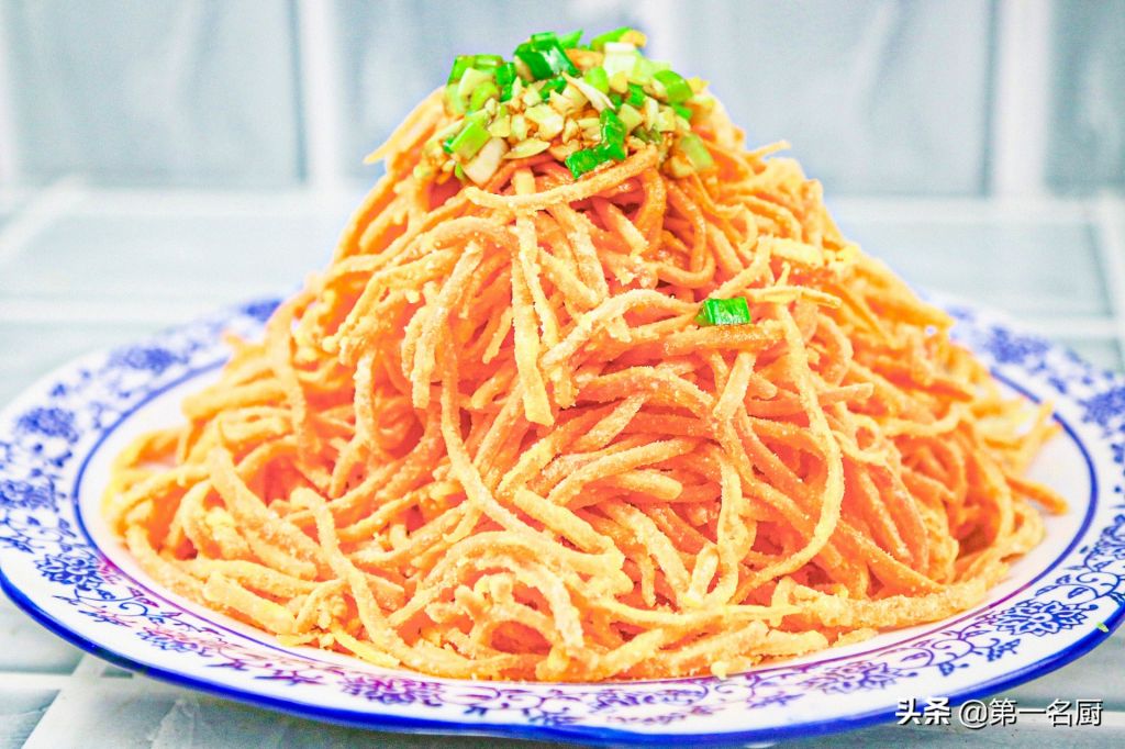 1.胡萝卜两根削去外皮,切成细丝,放入盆中,加入少许植物油,用筷子搅拌均匀,面粉适量倒入胡萝卜盆中,用手抓匀。