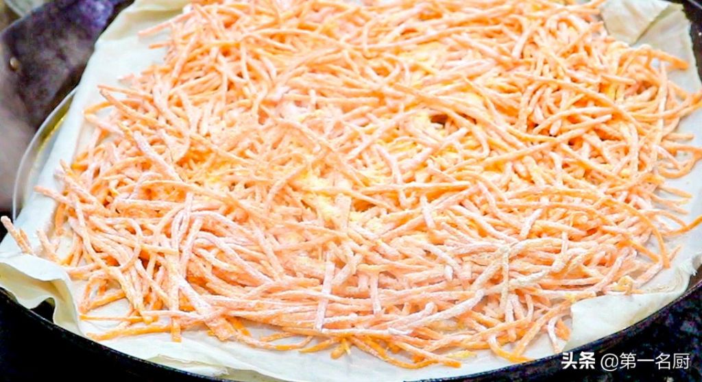 2.锅中烧水放上篦子,把水烧开,摊上蒸笼布,放入胡萝卜丝,盖上锅盖,开中火连续蒸五分钟。时间到了掀开锅盖,取出胡萝卜倒入盆中,用筷子抖散,撒上少许食盐,装入盘中备用。