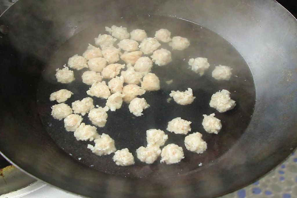 3.锅内烧水,大火烧开以后转小火,抓一把肉馅在虎口处挤成丸子,用小勺挖起放入锅内,肉丸子不要挤得太大,小一点容易煮熟入味。丸子全部下完以后稍微调大点火力,煮上3分钟左右,丸子全部飘起来就熟了,捞出来盛放在汤盆里面。
