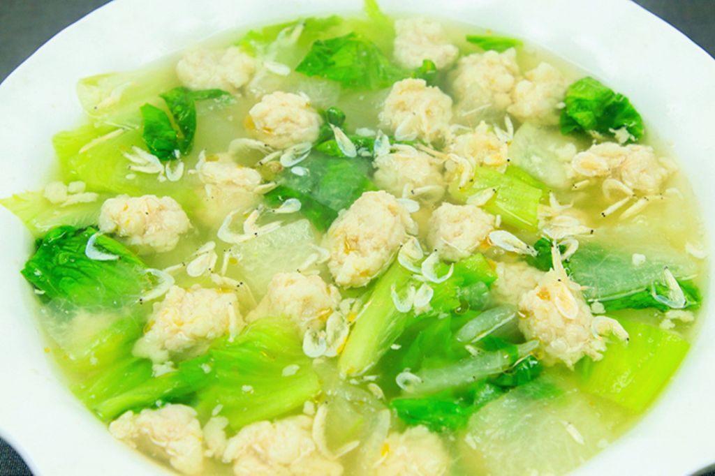 4.用刚刚煮丸子的水把冬瓜煮一下,把冬瓜开水下锅,加入食盐2克、鸡粉2克煮2分钟,冬瓜变软以后倒入生菜叶稍微烫一下立即出锅,和丸子放在一起,再浇上汤汁、撒上虾米、滴上几滴芝麻香油美味即成。
