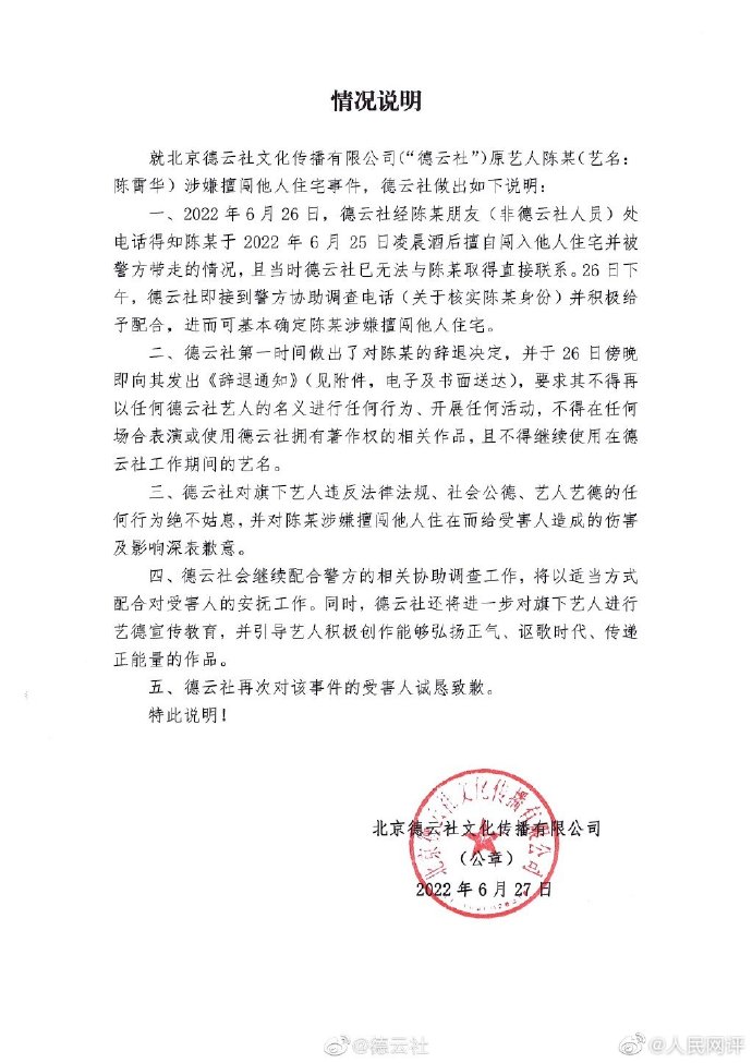 德雲社又攤上事了。據報道,德雲社原藝人陳某(藝名:陳霄華)於日前因闖入女生臥室侵犯未遂被抓。6月27日,@德雲社 發布情況說明稱,已第壹時間做出了對陳某的辭退決定,並於6月26日傍晚即向其發出《辭退通知》,與此同時對陳某行為給受害人造成的傷害及影響深表歉意。