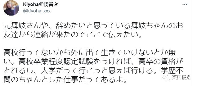 在这篇揭发花街丑恶的帖子里,她还告诉那些曾和她说想要退出的舞妓、前舞妓朋友们,