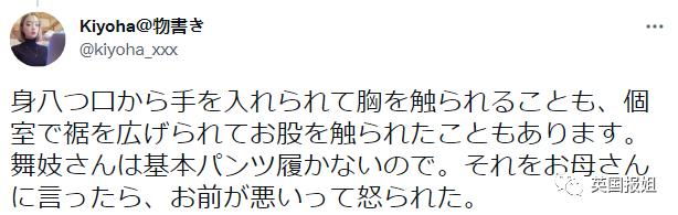 " 我曾被人从身八口(和服腋下一个口子,为了穿着时便于调整折叠部分)伸进手摸胸部,在单间里撑开下摆摸隐私部位的事也有。舞妓一般不穿内裤。