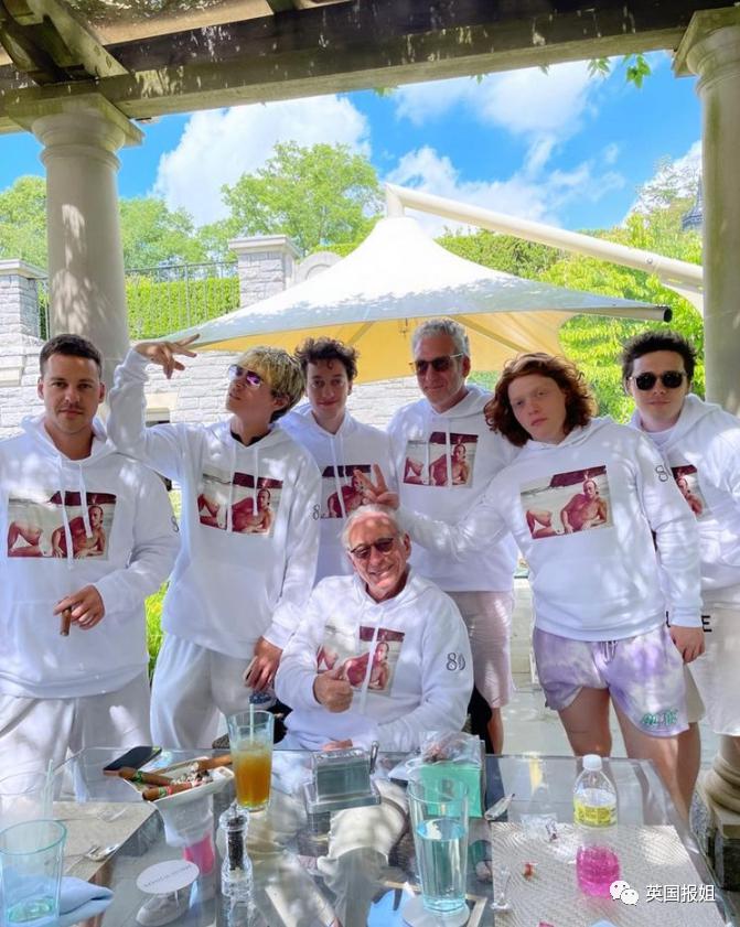 在妮可拉的照片中,布魯克林和老爺子的兒子們壹起穿上了慶生 T 恤,上面印著老爺子年輕時候的帥氣寫真,袖子上寫著 80,看地點應該是在老爺子的豪宅裡。家裡的男孩站成壹排,而布魯克林站在老爺子的小兒子身邊。