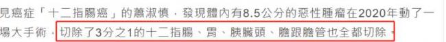 她的十二指肠内长了一个足足8.5公分的恶性肿瘤,为了保命,她在医生的建议下,入院接受手术,切掉了十二指肠、三分之一的胃、胆、胰脏头等多个器官。
