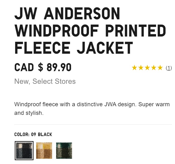 周六还在优衣库(UNIQLO)看到了UNIQLO x JW ANDERSON的联名系列,其中摆在商店入口最显眼位置的是这款JW ANDERSON 女装防风刷毛印花外套。