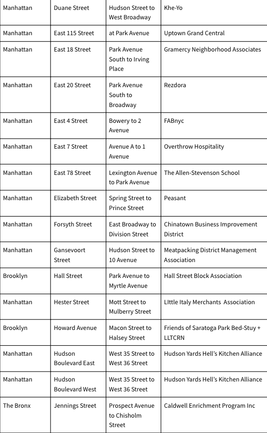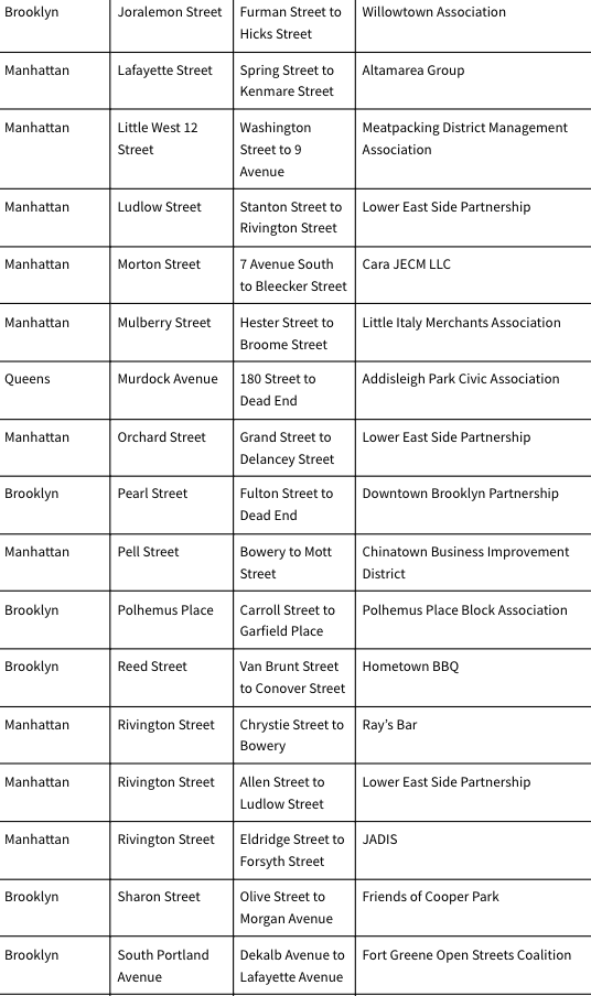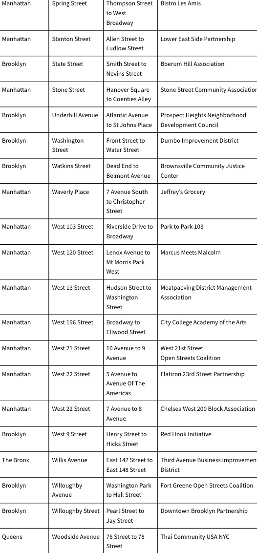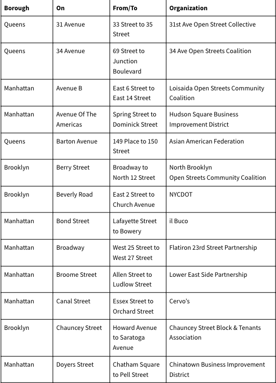 具體參與街道可見下方,或登陸https://www1.nyc.gov/html/dot/html/pedestrians/activations.shtml#calendar查詢。