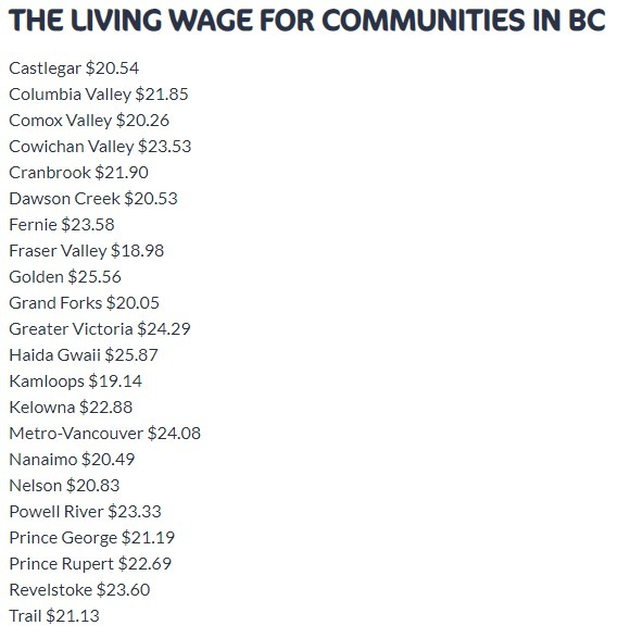 根據 BC 省的生活工資報告(Living Wage for Families)數據,BC 省最低生活成本的城市所需工資時薪為 $18.98。