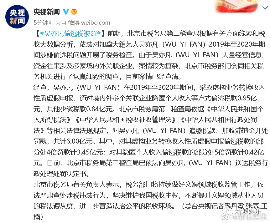 无论舆论对都美竹的评价如何,吴亦凡犯罪都是板上钉钉的事实。今天下午一同被曝光的,还有吴亦凡偷逃税的问题。据央视新闻,经查,吴亦凡在2019年至2020年期间,采取虚构业务转换收入性质虚假申报、通过境内外多个关联企业隐匿个人收入等方式偷逃税款0.95亿元,其他少缴税款0.84亿元。北京市税务局第二稽查局依据《中华人民共和国个人所得税法》《中华人民共和国税收征收管理法》《中华人民共和国行政处罚法》等相关法律法规规定,对吴亦凡追缴税款、加收滞纳金并处罚款,共计6.00亿元。其中,对其虚构业务转换收入性质虚假申报偷逃税款的部分处4倍罚款计3.45亿元;对其隐匿个人收入偷逃税款的部分处5倍罚款计0.42亿元。