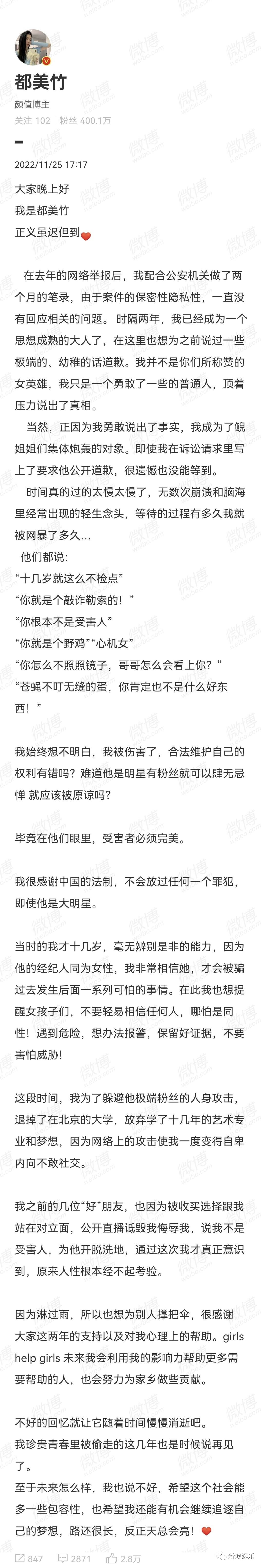 随后又发出长文表示“正义虽迟但到”。