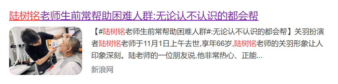 11月初,94版《三国演义》关羽扮演者陆树铭刚因心梗刚过世;