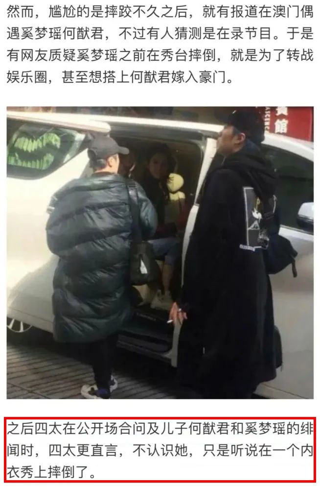 尽管在综艺上,何猷君对奚梦瑶百般宠溺。但豪门对儿媳要求一向严苛,梁洛施、吴佩慈这样的女星,追着给豪门生孩子,也没能有个名正言顺的身份。四太在面对记者提问时,回复:不认识奚梦瑶,只知道她在一个内衣秀上摔倒了。