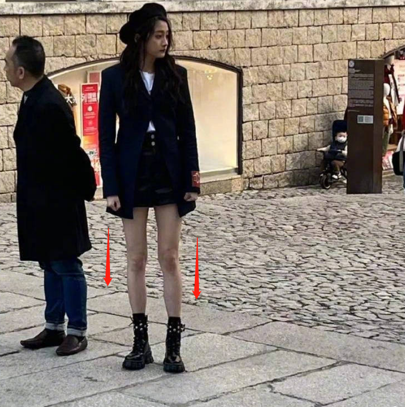 上身是一款长款斜领西服,里面是一款白色T恤,下身则是一件超短热裤,再配上一双光溜溜的大长腿和同色系短靴,整身造型简洁酷炫,还能挡住她的腰部和臂膀,遮挡身材短板,优化比例,让她看起来又高又瘦。对比她以往的礼服战袍,这一套造型可真是选对了。