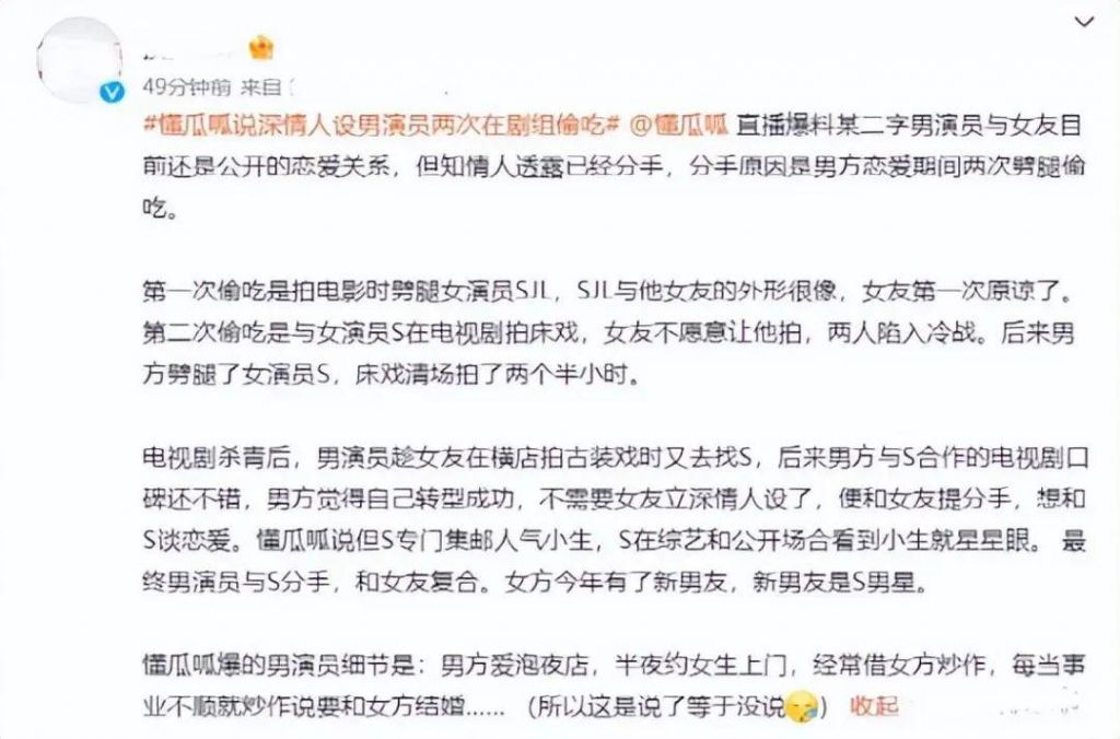 当然了,这场分手传闻实在是有些蹊跷,原本两人都好好的,却突然空降这一传闻,紧接着又被娱记曝出疑似男方劈腿的画面,还有另一位娱记甩出长文,称男星在有女友的情况下两次劈腿,与合作过的女演员恋爱,其中有网友根据长文中扒出的细节推测出是鹿晗、关晓彤、宋妍霏、孙嘉灵。