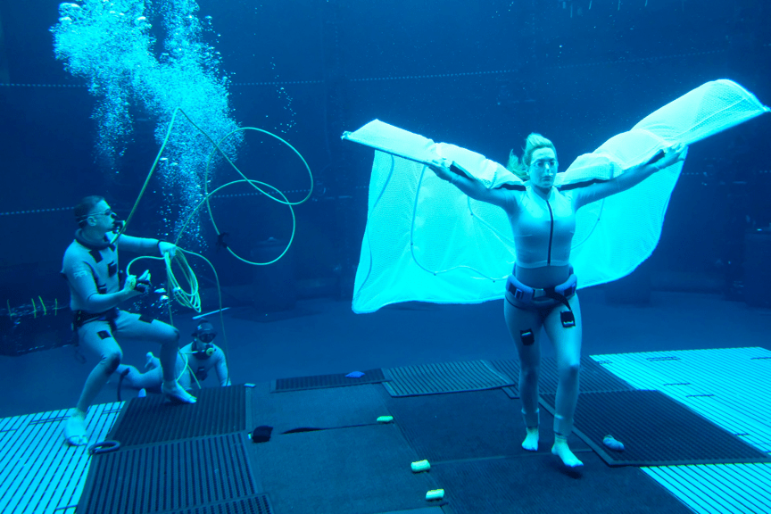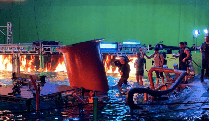 为此,他使用了在《阿凡达》第一部拍摄时尚不存在的水下动作捕捉技术,建造了一个巨型水箱,利用泵来制造真实波浪,并将摄影轨道与模拟海底环境的水箱结合。