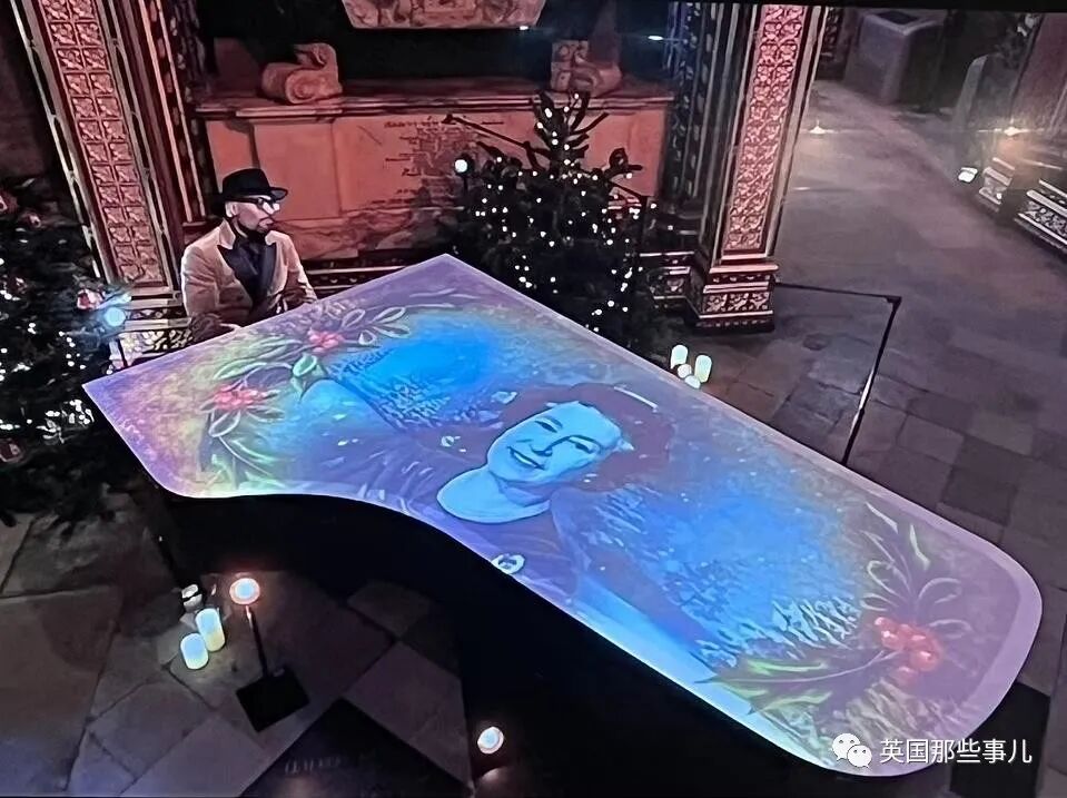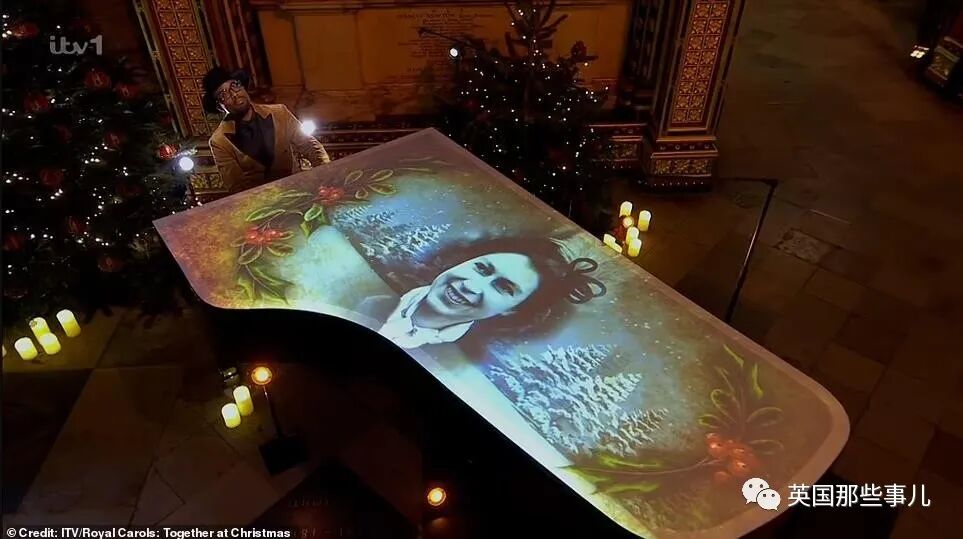 说回圣诞颂歌音乐节,音乐家亚历克西斯·弗伦奇 (Alexis French) ,弹奏了《凄凉的隆冬(In The Bleak Midwinter) 》,钢琴上是女王不同时期的投影,配上音乐,狠狠赚了一波眼泪。
