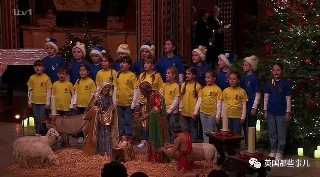 另外还有一些零散的表演,比如他们请了一些因逃离战争而来到英国的乌克兰儿童,穿成乌克兰国旗的样子,合唱了一首《马槽圣婴(Away in a Manger)》。