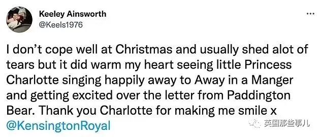 “我圣诞节应对的不好,一般总是要掉好多眼泪,不过夏洛特小公主今年的反应还是很暖了我一下,谢谢你让我微笑,夏洛特。”