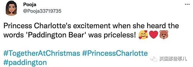“夏洛特小公主听到‘帕丁顿熊’的那个兴奋劲儿,太可爱了,无价之宝。”