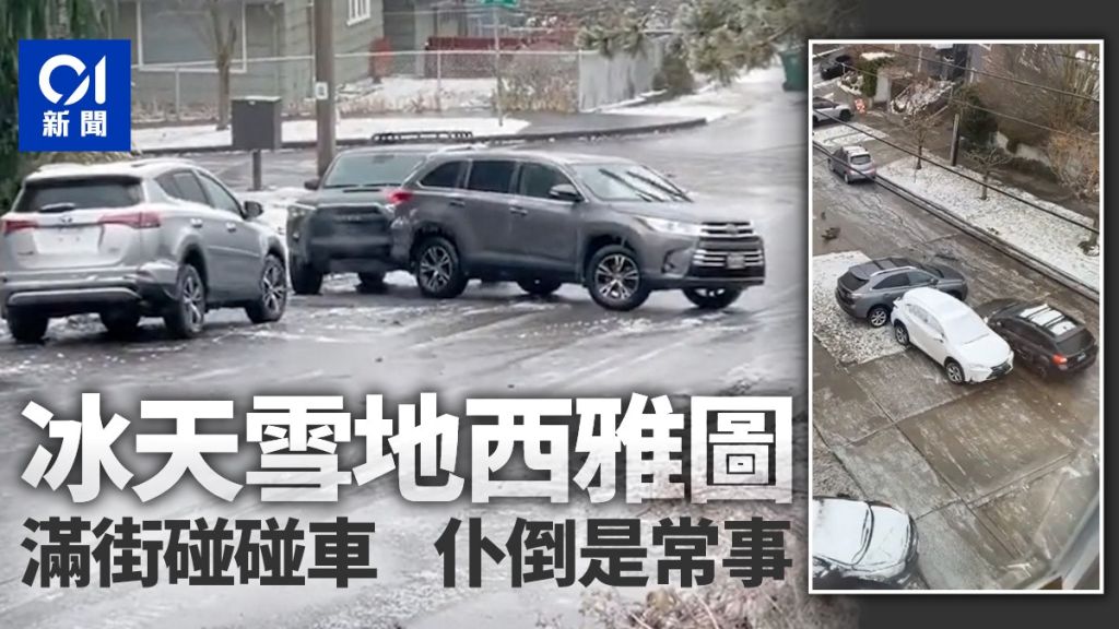 位于西北部华盛顿州的西雅图市(Seattle)也冰天雪地;从当地居民拍下的的影片可见,道路“冰封”导致车辆滑行相撞,甚至有行人必须在上坡路段“攀爬”前进。