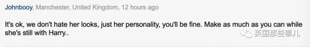 “没关系,我们不讨厌她的长相,讨厌的是她的性格,不针对你。趁梅根还没跟哈里离婚,快多搞点钱吧。”