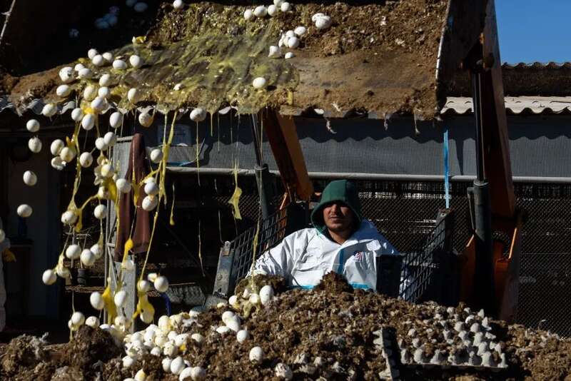 2022年1月3日,工作人员在以色列马尔加利奥特的农场销毁鸡蛋 图片来源:新华社