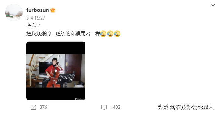 接著孫儷又因為大提琴考試獲關注,她考了大提琴的資格考試,自嘲“臉像猴屁股壹樣”,壹張截圖看得出來孫儷的臉紅紅的,評論區也全是在誇她愛好廣泛,是娛樂圈的壹股清流之類的話。