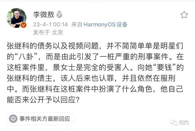 但张继科的律师声明并未能阻止李微敖再度发文爆料。李微敖随后又两度发文,且爆料的内容更加细节具体。