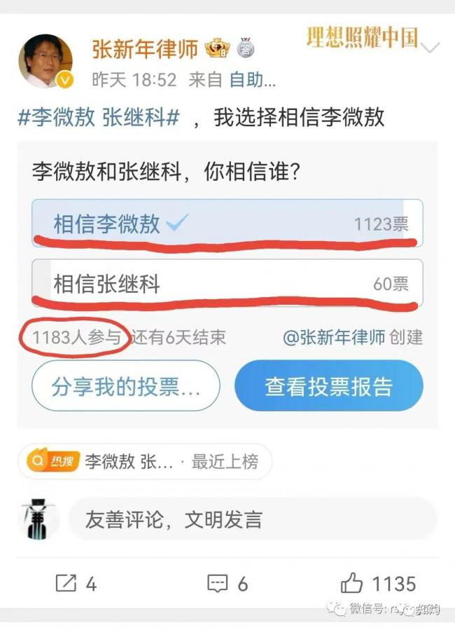 而知名张新年律师在网上搞了个“李微敖和张继科,你相信谁?”的调查,目前的结果是1183人参与的调查中,95%的网友选择相信李微敖,选择相信张继科的只占5%。