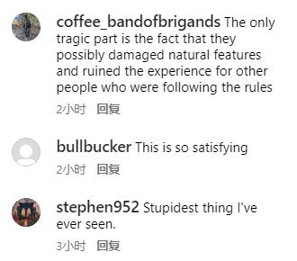 很多網友留言譴責這些游客的危險行為,認為該路段應該是園方禁止通行的地方。