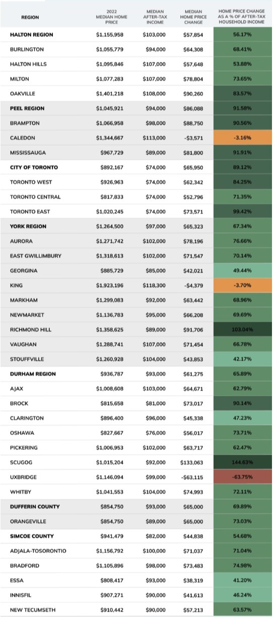 根據這份報告,大多地區的列治文山(Richmond Hill)和斯庫戈(Scugog)是房價上漲明顯優於工資收入的地方。