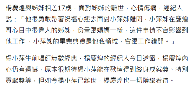 弟弟杨庆煌也通过经纪人表达了他的哀痛之情,“他会勇敢地去面对姐姐的离开,而且,姐姐在他心目中十分伟大,就跟妈妈一样。” 此外,杨庆煌内心也有一些遗憾,因为姐姐杨小萍生前作品无数,但从未得到过终身成就奖、或是特别贡献奖等,如今斯人已逝,弟弟杨庆煌也表示一切随缘。至于杨小萍告别式时间,杨庆煌的经纪人则低调表示,去世后她是临时代表杨庆煌出面发言,至于具体细节这部分要先跟杨庆煌沟通后,才会公开发布。