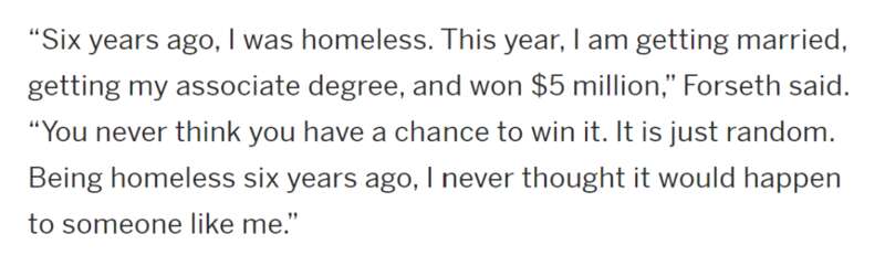“6年前,我无家可归。今年,我要结婚了,拿到了副学士学位,还中了500万美元大奖!”福塞斯(Forseth)补充到,“就是,从来没有想过有机会能中大奖,尤其是对于我这样,6年前处于无家可归的人,我没想到这样幸运的事情会发生在我这样的人身上。”