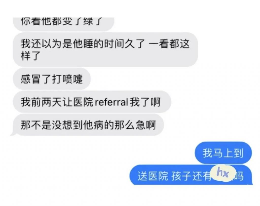 4月4日,Y发孩子图片给C,让C买感冒药。C一看图片发现孩子全身的颜色都变了,赶紧过去把孩子送去急诊,然而已经太迟了,孩子在医院被宣布死亡。- 新闻来源于其它媒体,内容不代表本站立场!