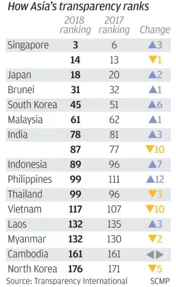 国际机构曾发布的部分亚洲国家清廉指数及排名的变化