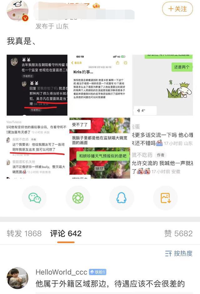 还有网友对吴亦凡的精神状态关注不已,这位网友也表示监狱里面不允许交流,自己去看望朋友时喊了吴亦凡都被管教批评了。