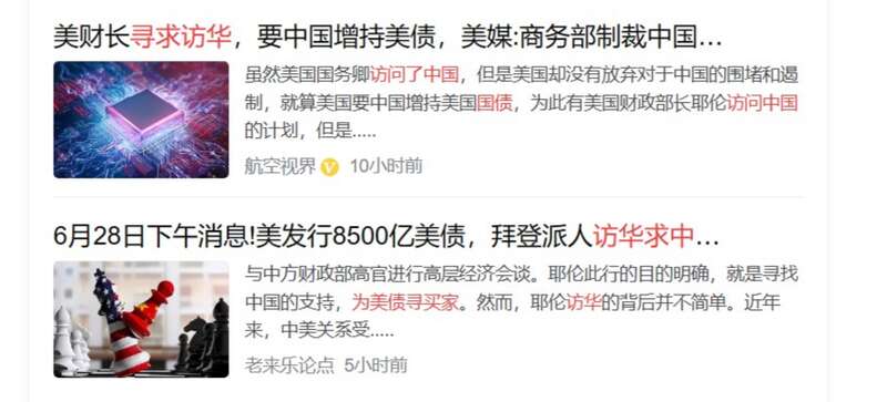 美国国债的一举一动,都能长时间占据我们媒体头条与热榜。之所以如此,是因为我们大多数同胞认为,美国发行国债,需要乞求我们购买,我们购买美债,是对美国的大力支持,是我们借钱给美国人花。惹烦我们,抛了美债,美债就要崩盘了,美国就要发生债务危机了,美国经济就要衰退了,美国就要衰落了。以至于但凡美国财长访问中国,自媒体一定会有大量的“来求我们买美债“的文章。