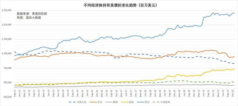 我们长期减持美债的同时,欧洲持有的美债一直在持续增加。与2011年9月对比,2023年1月,我们累计减持了4108亿美元,但欧盟、英国、日本(专题)累计增持了14826、5568、1204亿美元。