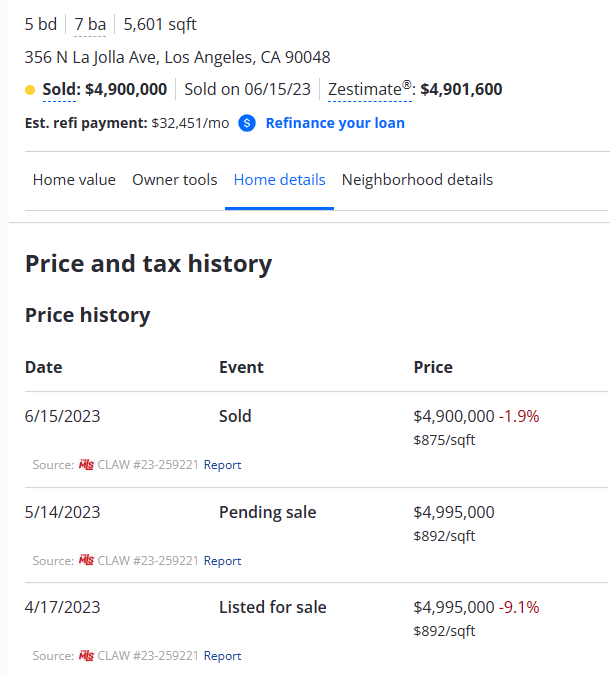 从出价历史可以看到,其挂牌价格为499.5万美元,成功避开了500万美元的“豪宅税”门槛。